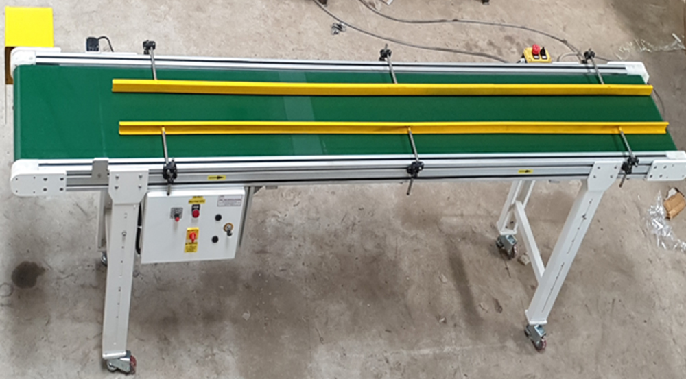 Equipped with a durable white belt made from PVC or polyurethane, this conveyor delivers excellent tracking, clean handling, and resistance to wear. The white color is ideal for applications that require better visibility for product inspection or a cleaner aesthetic, often used in industries like pharmaceuticals, cosmetics, electronics, and general light manufacturing.