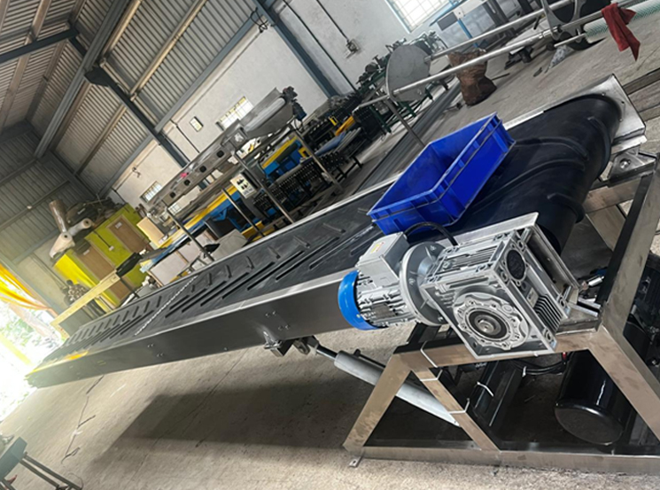 Ideal for handling loose or bulk materials such as grains, coal, sand, fertilizers, or packaged goods, this conveyor is widely used in agriculture, mining, recycling, and material processing industries. The chevron cleats guide materials securely along the belt, ensuring smooth and controlled movement even on steep inclines up to 30–40°, depending on the load.