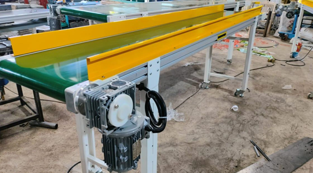 A Flat Belt Conveyor is one of the most commonly used conveyor systems for transporting products across short or long distances in a smooth, efficient manner. It features a continuous flat belt made of materials like PVC, PU, or rubber, which is driven by pulleys or rollers.